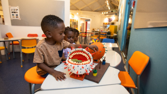 A green, open-air area with devices that depict natural phenomena. Visitors can climb a giant cell that is actually a slide, watch waves form while riding a bike, understand how the human auditory system works, or even lie down on the lawn and read a book!