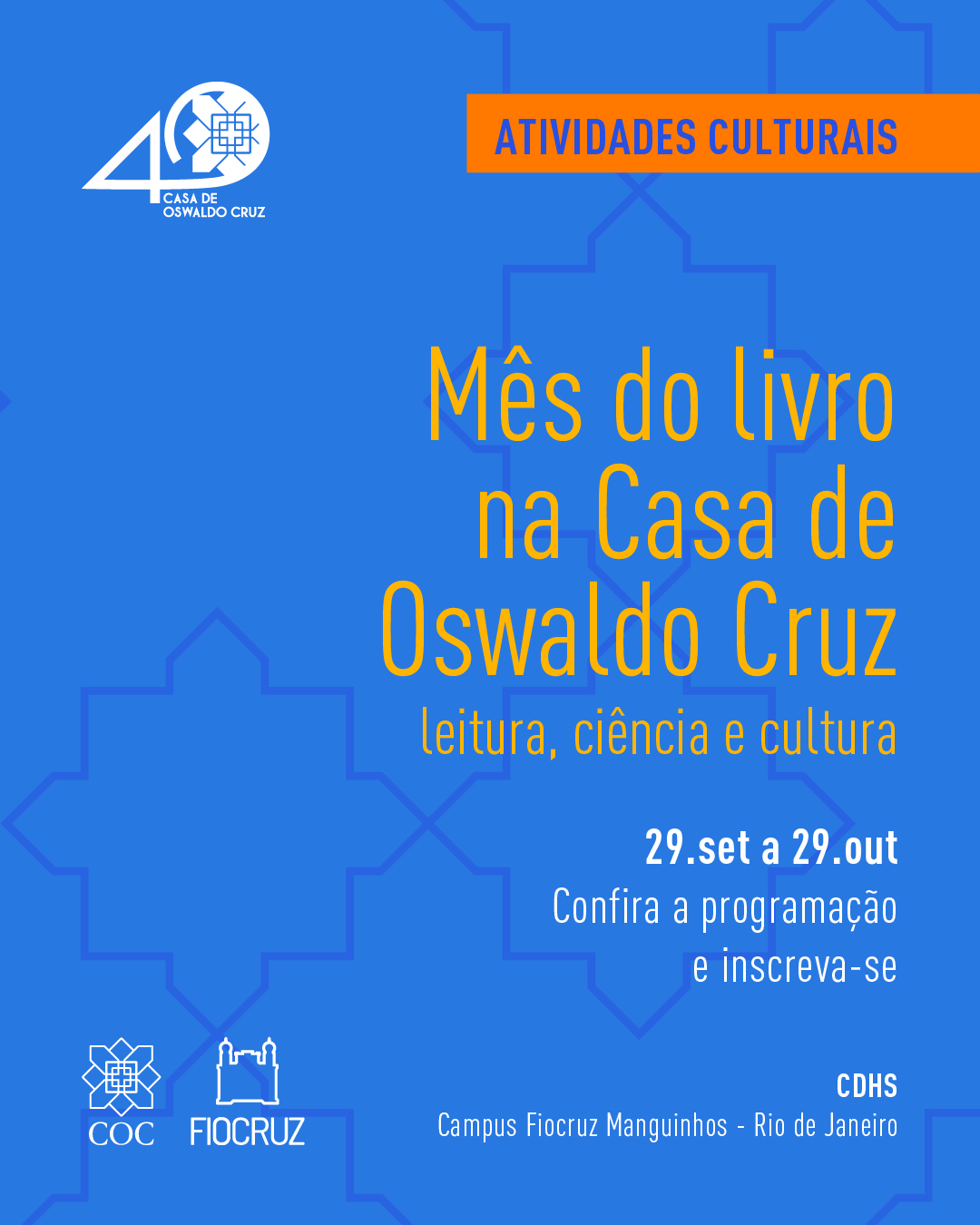 13/10, às 14h - De leitor para leitor: conhecendo a coleção de livros de Oswaldo Cruz. Visita guiada ao acervo da Biblioteca de História das Ciências e da Saúde e suas coleções especiais, exposição de livros da Coleção Oswaldo Cruz e bate-papo com bibliotecárias sobre as obras selecionadas.